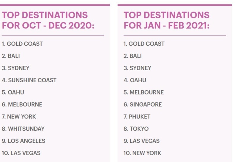 Bali is balmy year-round, as is the Gold Coast, making them perfect for a springtime escape, and contain both family-friendly and youth-related activities. Warm weather locales Bali made the list, showing that Australians are looking for tropical hot spots. They might also be wanting to engage in outdoor exploration after being kept inside for weeks.